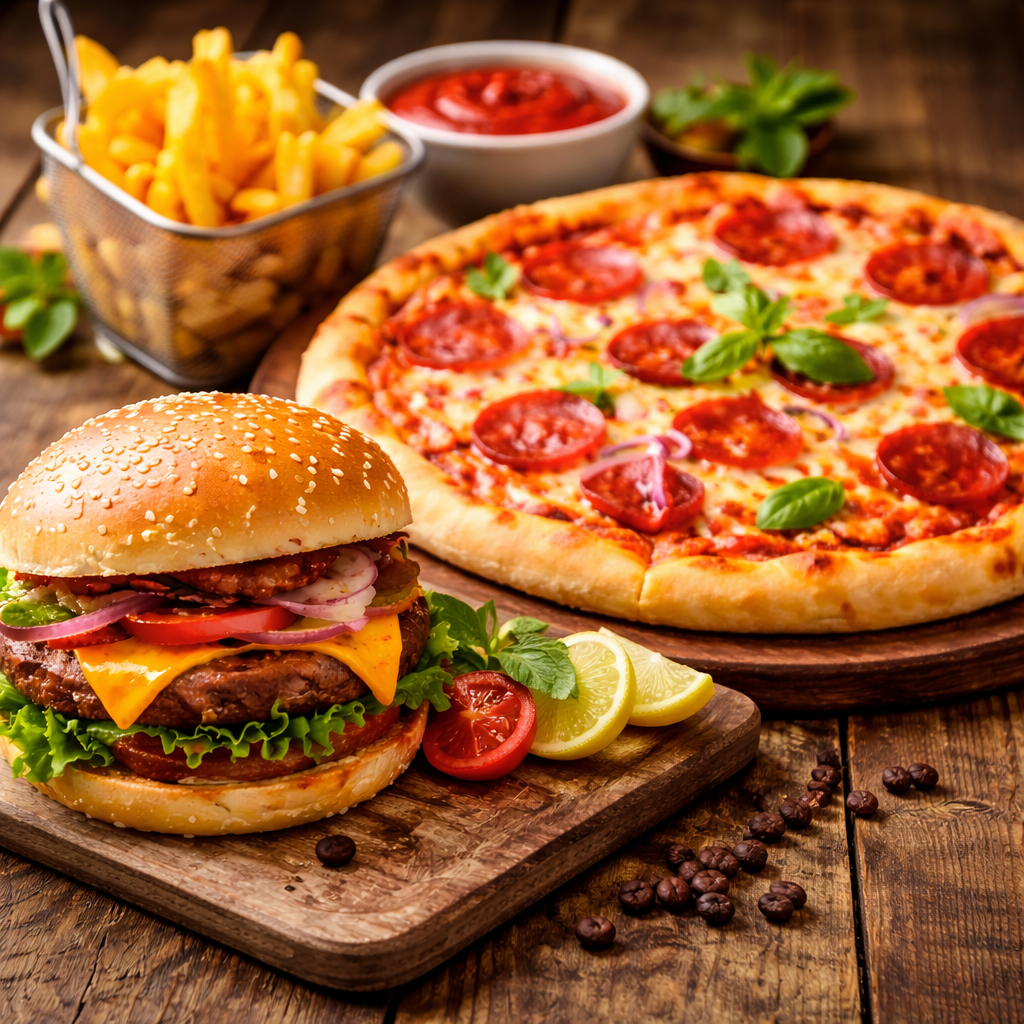 Delicious pizzas and juicy burgers served with crispy golden fries — perfect for every craving.