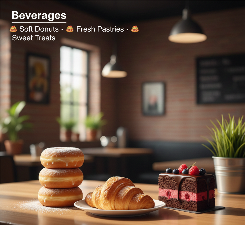 Indulge in our freshly baked delights – soft, fluffy donuts, golden pastries, and sweet treats that brighten your day.